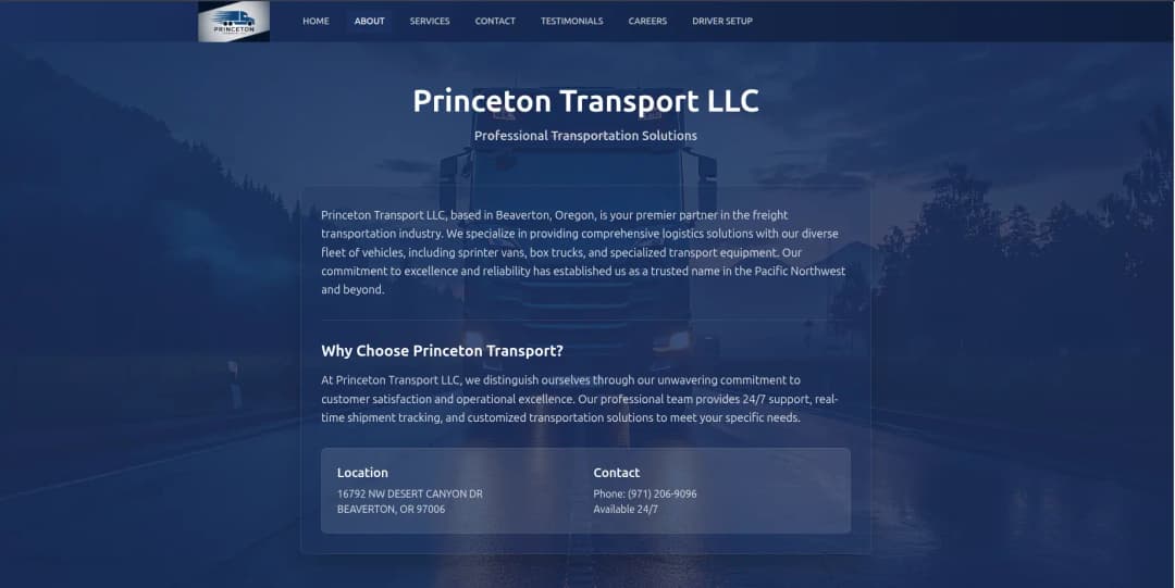 Developed a professional, responsive website for Princeton Transport LLC, a Beaverton-based logistics company. The site highlights their transportation services, nationwide shipping solutions, fleet capabilities, and driver opportunities. It features service detail pages, testimonials, career application forms, and contact options designed to enhance client trust and streamline recruitment.